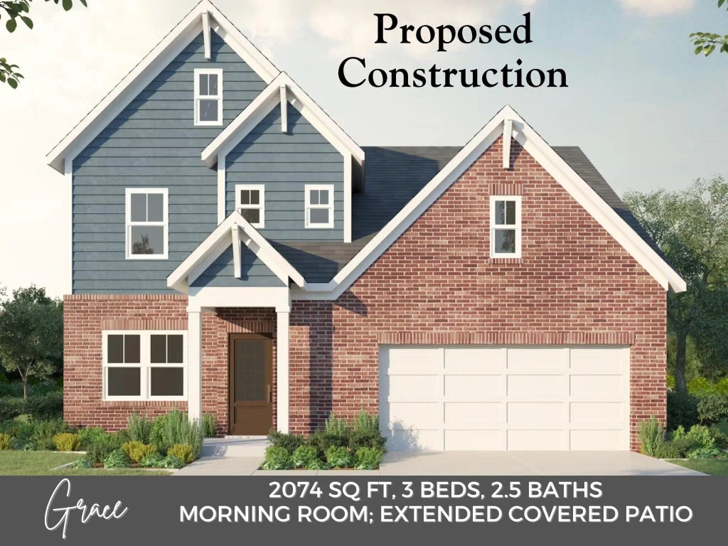 PROPOSED CONSTRUCTION by James Monroe Homes. The Grace plan offers homeowners the perfect balance of living area on the first floor and bedrooms on the second floor. The exterior features the choice of a Farmhouse, French Country, or Cottage facade. A flex room off the foyer provides the home buyer the autonomy to decide how to use the space to best fit his/her needs. The kitchen includes a center island and stainless appliances. An optional morning room adds 240 square feet of living space to your home. An optional extended covered patio off the family room and optional extended front porch offers a view of the lush landscaping. The first floor includes a floating breakfast area, a living room, and an area for a bench to be built. The second floor owners suite offers a linen closet, the option for an oversized spa shower, and a walk-in closet. The second floor offers two additional bedrooms, a shared full bath, and a laundry closet. These connected living features are included in every James Monroe Home: a Ring doorbell and chime, WiFi garage door opener, 2 Brilliant dimmer switches, a data hub, and a Wifi thermostat. Pictures are of a similar Grace home.