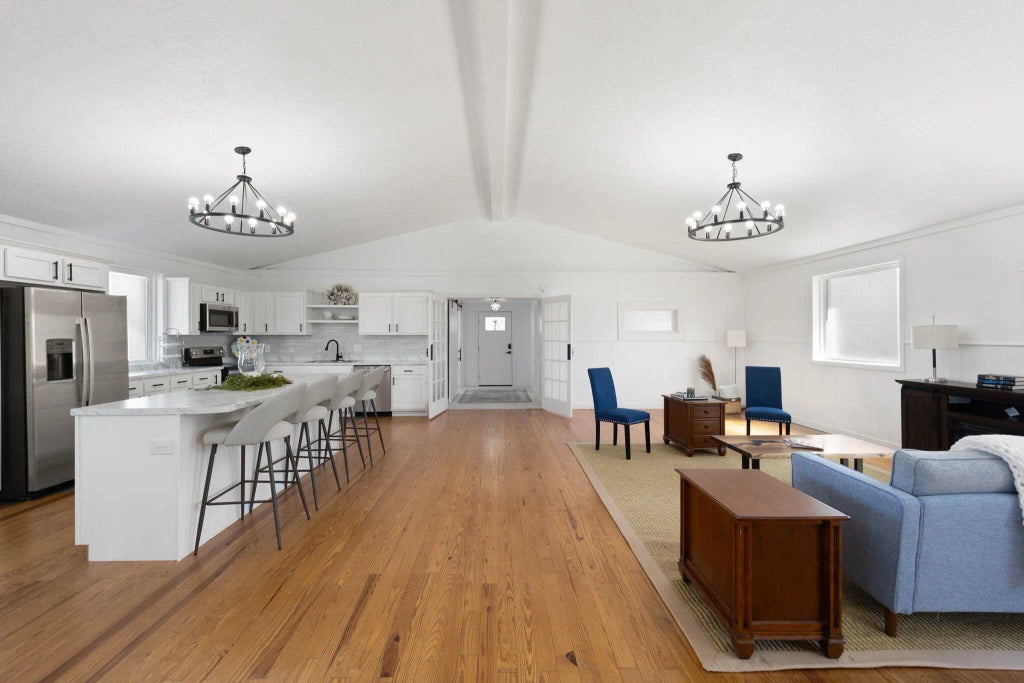 Discover this absolute stunning 5-bedroom, 2-bath home, offering endless possibilities as a short-term rental or primary residence. Located just 5 miles from the breathtaking Lake Cumberland and conveniently close to town, this spacious 2,500 sq ft property blends original charm with modern upgrades. The owners mastered the task of transforming a vintage structure (formerly a church) into a breath taking Open Floor Plan home. The hardwood flooring is something to see & the wood accents truly compliment the home's trendy color scheme. There is a nice spacious side deck and an oversized blacktop space for constructing a detached garage, parking a boat, a RV, a camper, lake toys etc. The basement area can be used for extra sleeping space, a recreational area, a home gym or additional storage. This Unique property is truly magazine worthy! As the new owner of this property, you would be the envy of your friends & family. As a short term rental, the character & uniqueness of this property would certainly catch the attention of online viewers! So whether you're seeking a new place to call home, looking for a peaceful getaway or wanting an investment property - this one checks all the boxes!